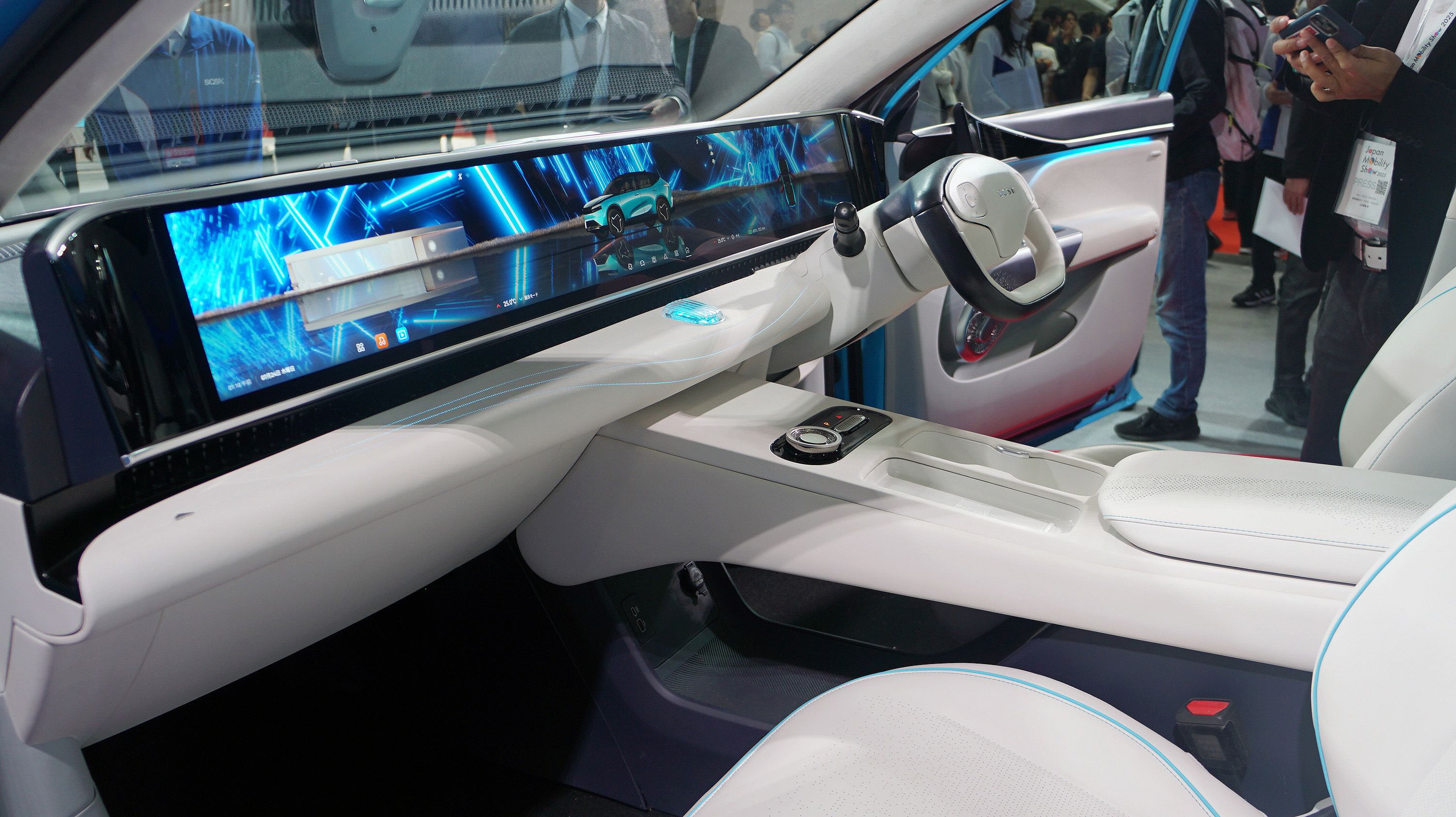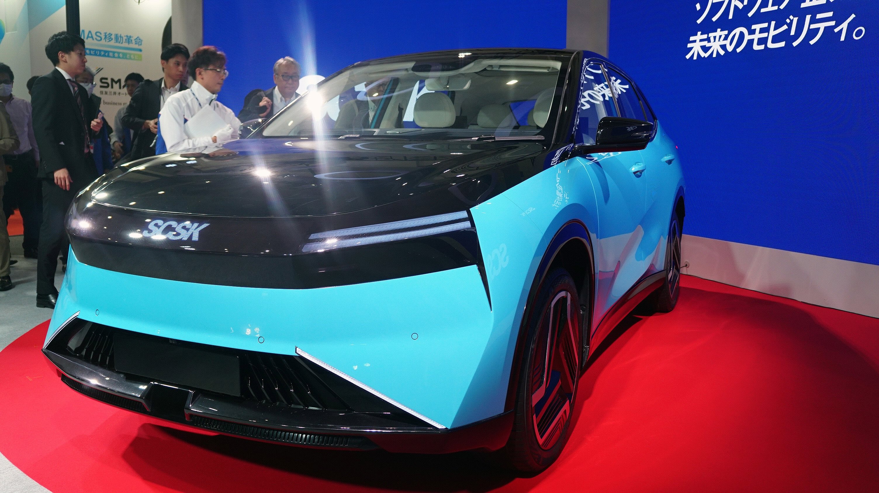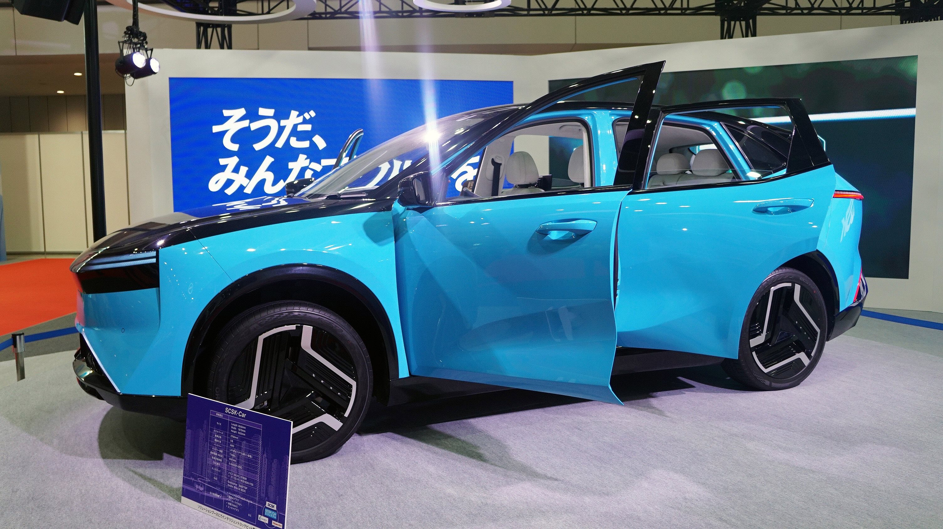 SCSK-Carは、今の時流をしっかり取り込んで5人乗りのSUV型のEVだが、外観のモチーフはドルフィン=イルカで、シャープなデザインとなっている。航続距離は600キロ+。室内も広々としている。目を引くのは運転席のピラーから助手席までのピラーに44.6インチのディスプレーだが、インパネなどによる凹凸がなくなったの広い室内の演出のアシストをしている。ディスプレーは、運転席と助手的では別々なものを分割表示できるのは言うまでもない。AIも組み込まれており、エアコンなどの捜査、ゲーム、観光案内などは音声を通じてAIエージェントが担ってくれる。