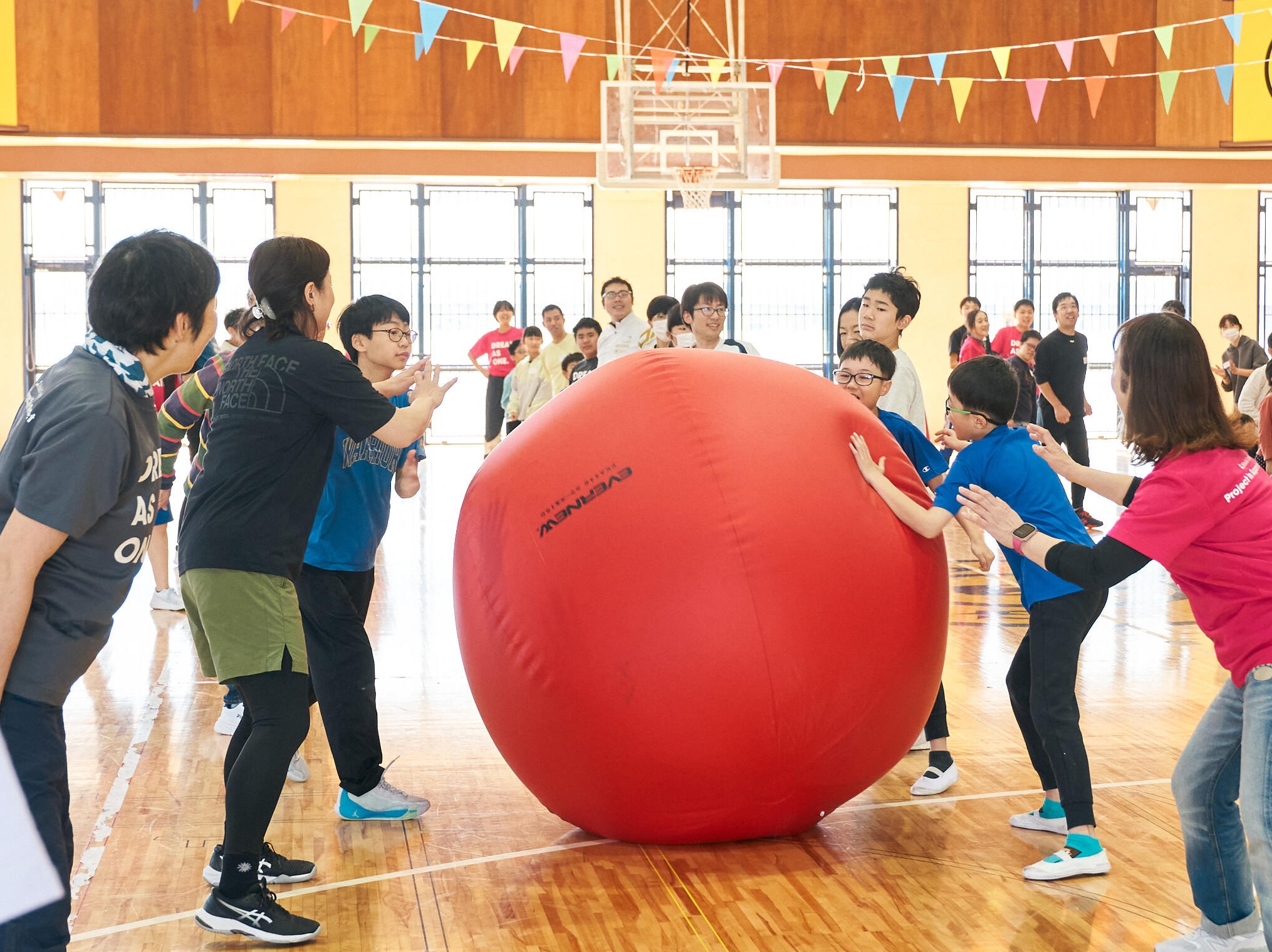 2種目は大玉送り。大人の背丈ほどもある大きな玉を、チームごとに列になってゴールまで送っていくゲームだ。最初はコントロールが難しかった大玉が、回を重ねるごとにまっすぐスピードアップして転がっていく。ほんの10分ほどの短時間でも、子どもたちがコツを掴んで上達していくのが目に見えて分かる。