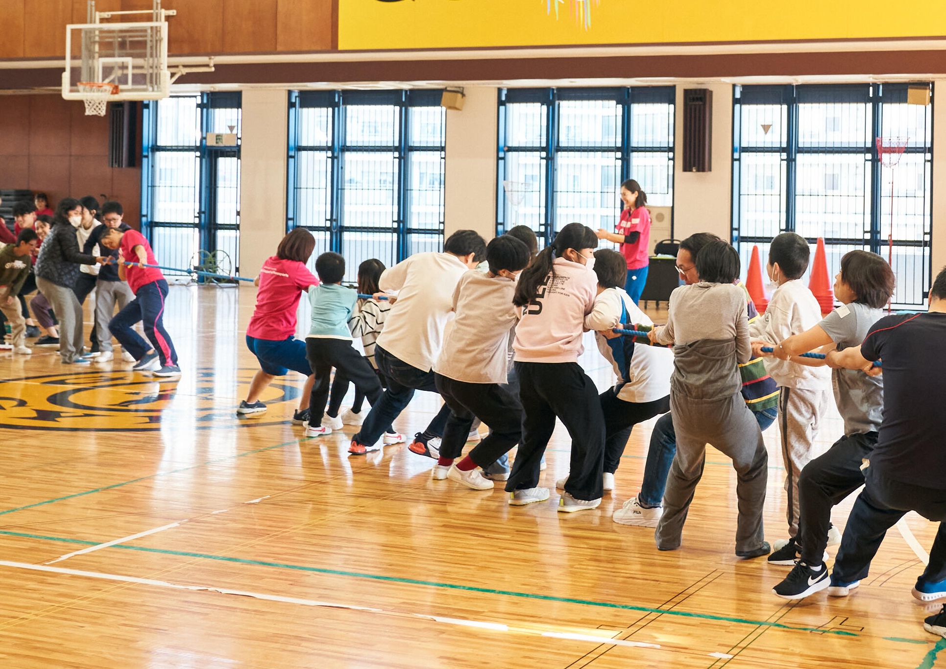 3種目は綱引き。スタッフも両チームに分かれて参加し、綱を力いっぱい引っ張り合う。大人も子どもも全員顔をゆがめて渾身の力で引っ張っていた。全部で3回戦まであったが、初戦で力を使い果たし、大の字になって伸びている保護者も。一方、子どもたちはまだまだ元気でやる気満々だ。