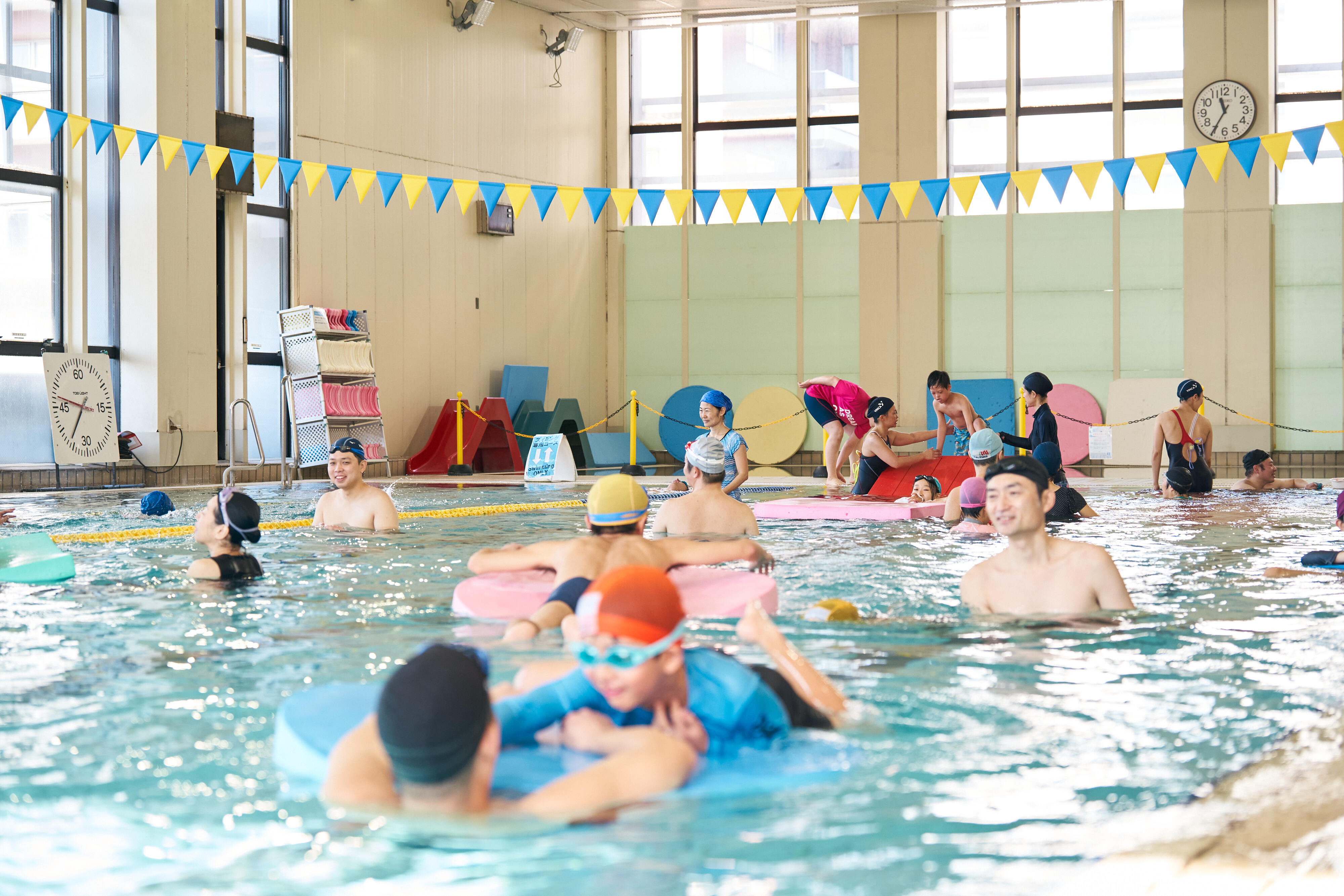 その後は、水着に着替えてプールへと移動。泳ぎたい人用のコースで黙々と泳ぐ子もいれば、プール内に設置された滑り台で遊ぶ子や浮き板の上に乗って遊ぶ子など、思い思いのエリアで自由時間を過ごす。スタッフ以外に保護者も一緒に水に入っているので、安全性の面でも安心だ。