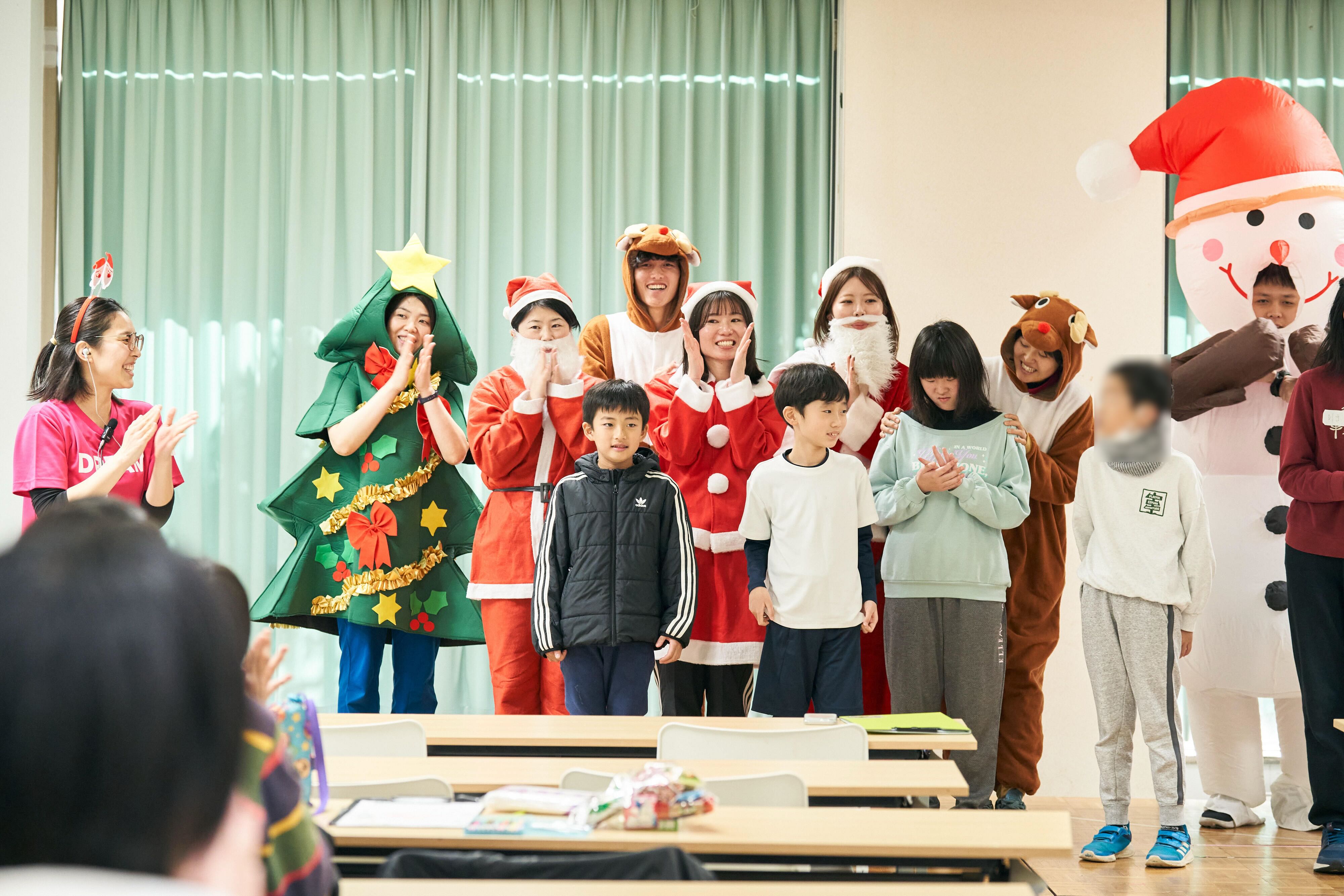 プールの後は着替えてホールへ戻り、ちょっと早めのクリスマス会。サンタや雪だるまに変装したスタッフがクリスマスソングと共に登場し、子どもたちにプレゼントを手渡していく。